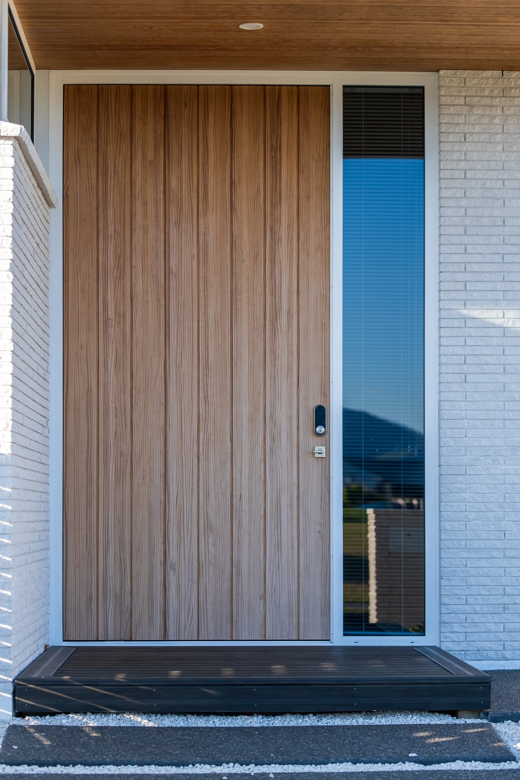 This architectural language is expressed predominantly through rectilinear forms and horizontal spatial planning, stretching the building along the north-south axis of the long site. The material palette is pared back—neutral whites and strategic use of more textural materials such as split-face brick veneers and rich timber for the soffits and entrance door.