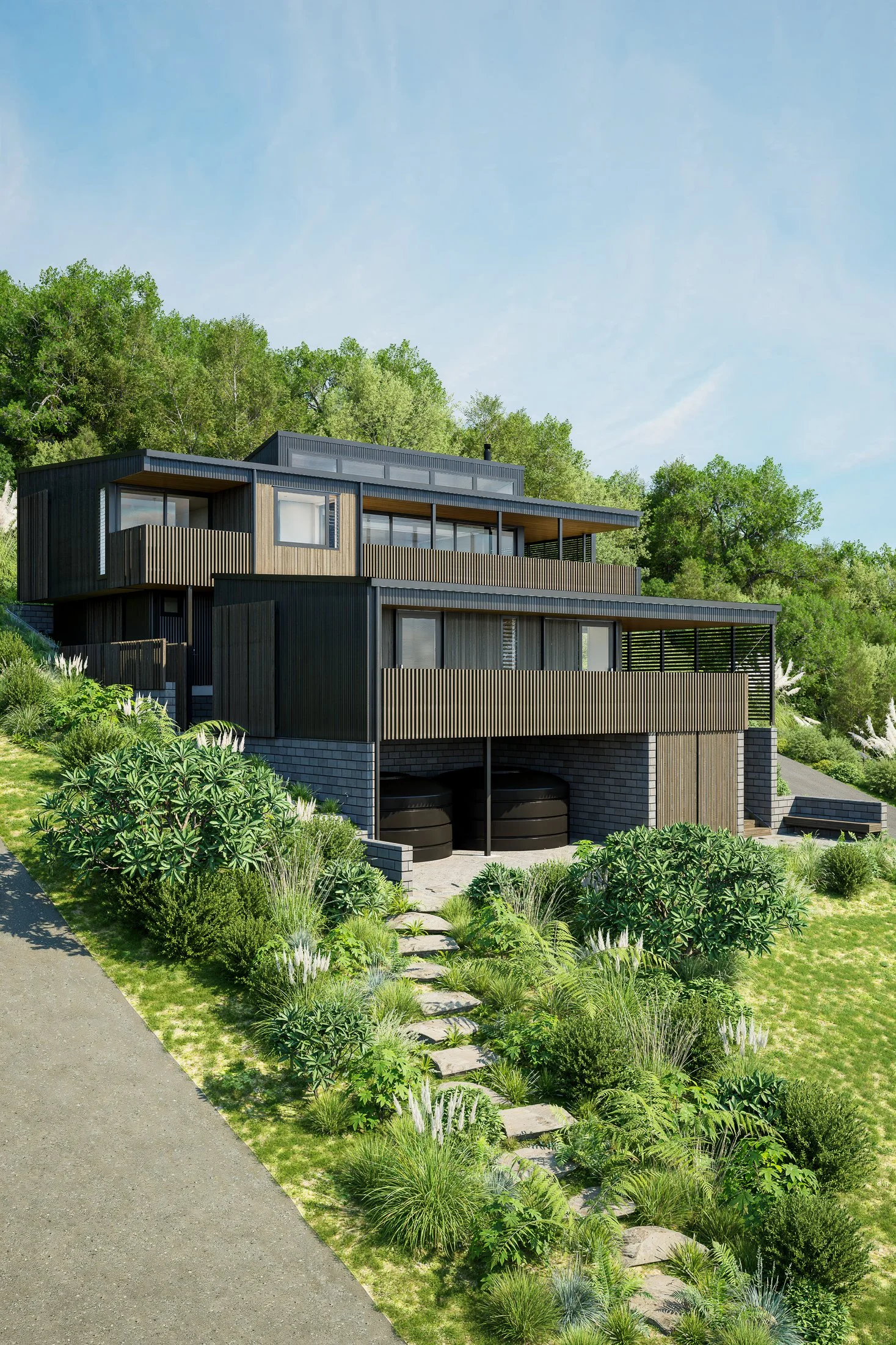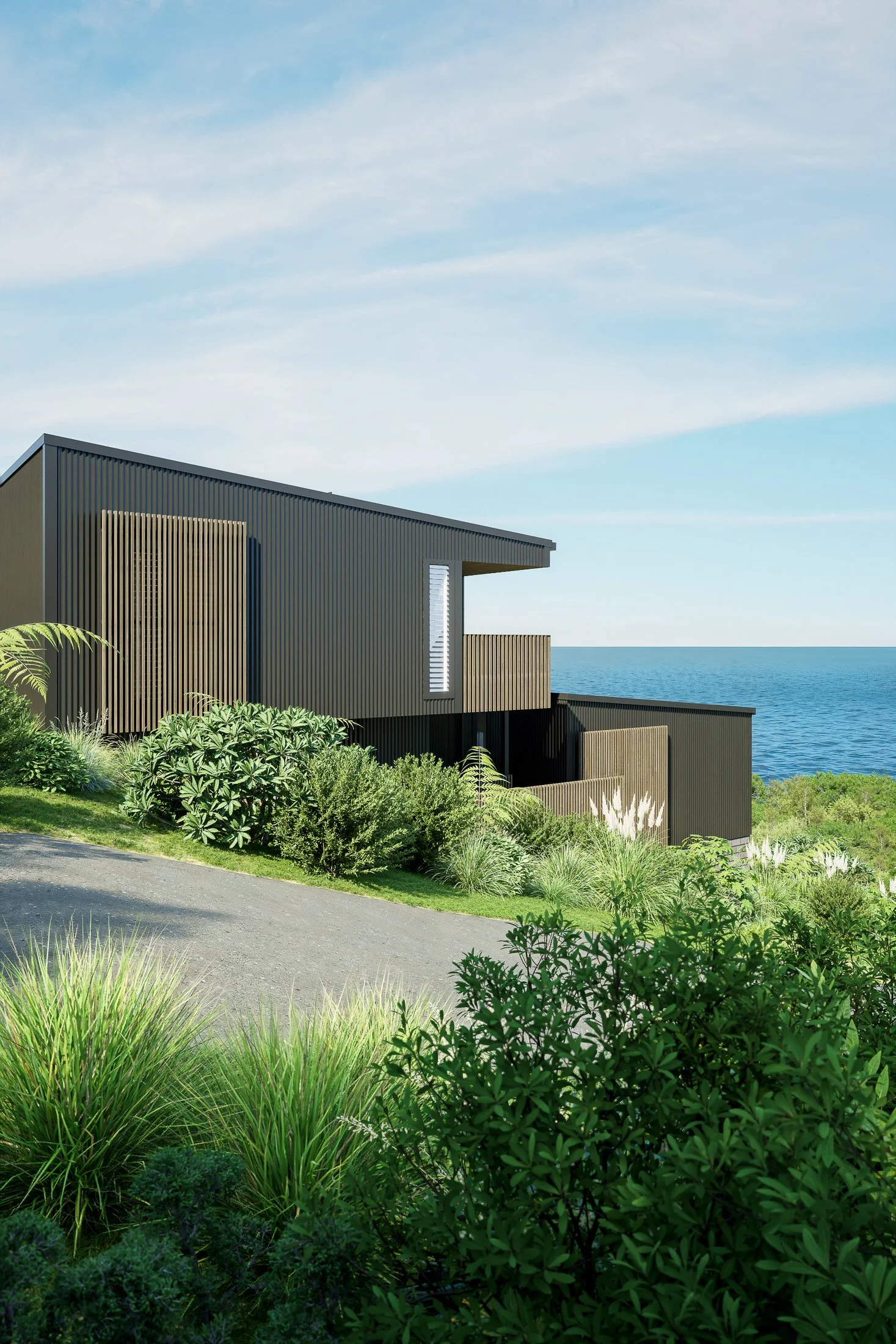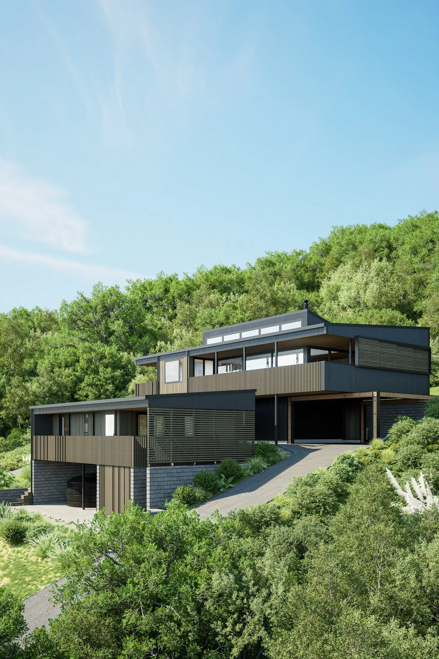 The form and materiality draw inspiration from New Zealand's coastal vernacular, particularly the classic bach, symbolizing simplicity and practicality. Clad in Abodo Vulcan Sioo:x, the house is grounded in its natural surroundings, with tones that echo the coastal landscape.